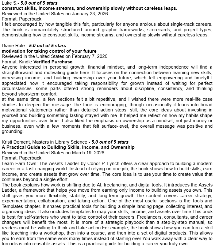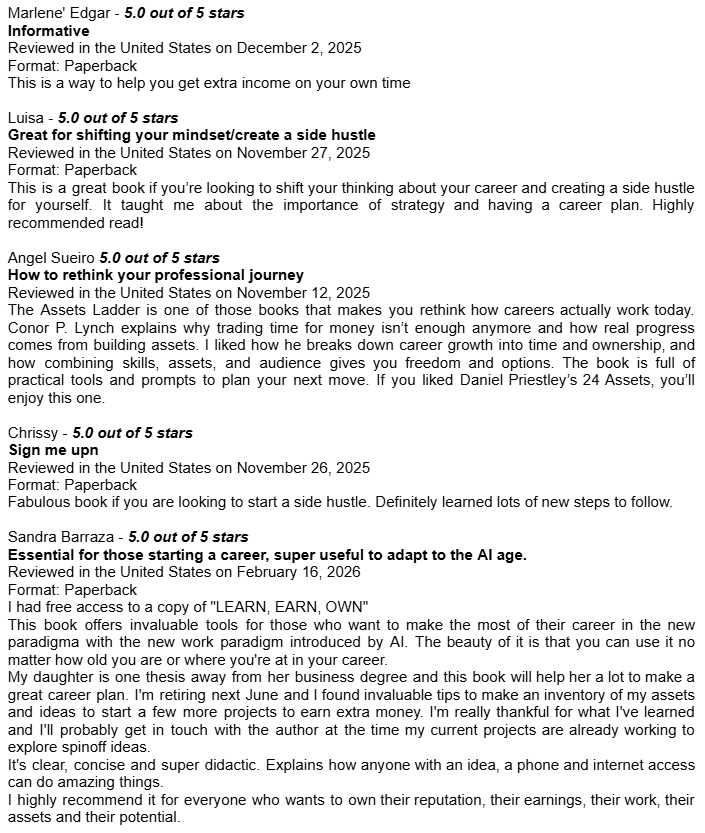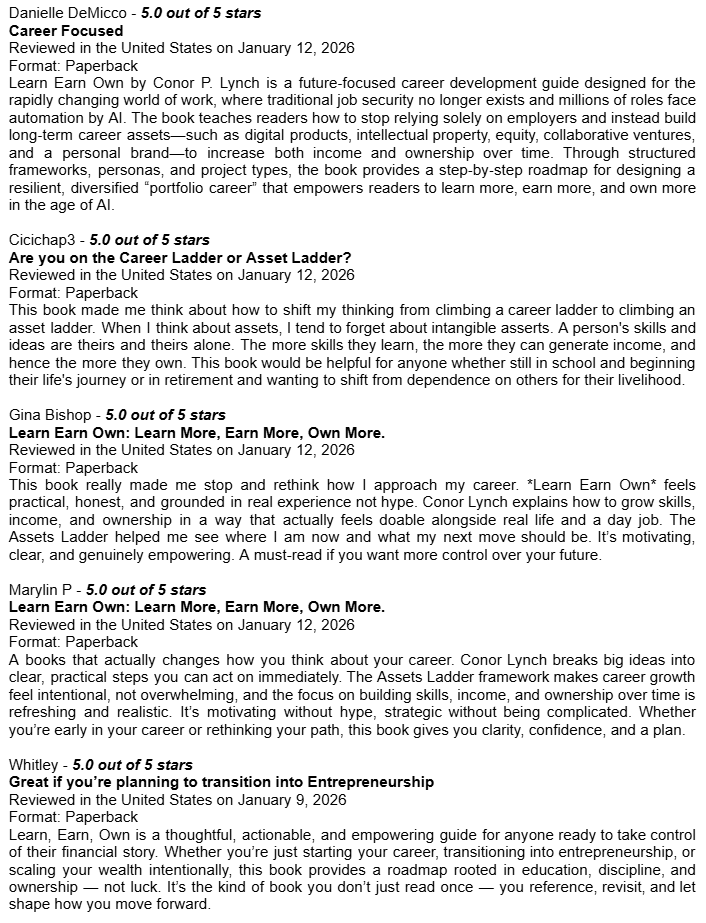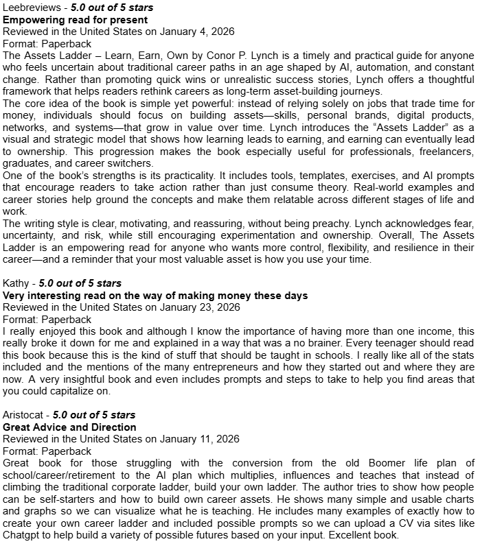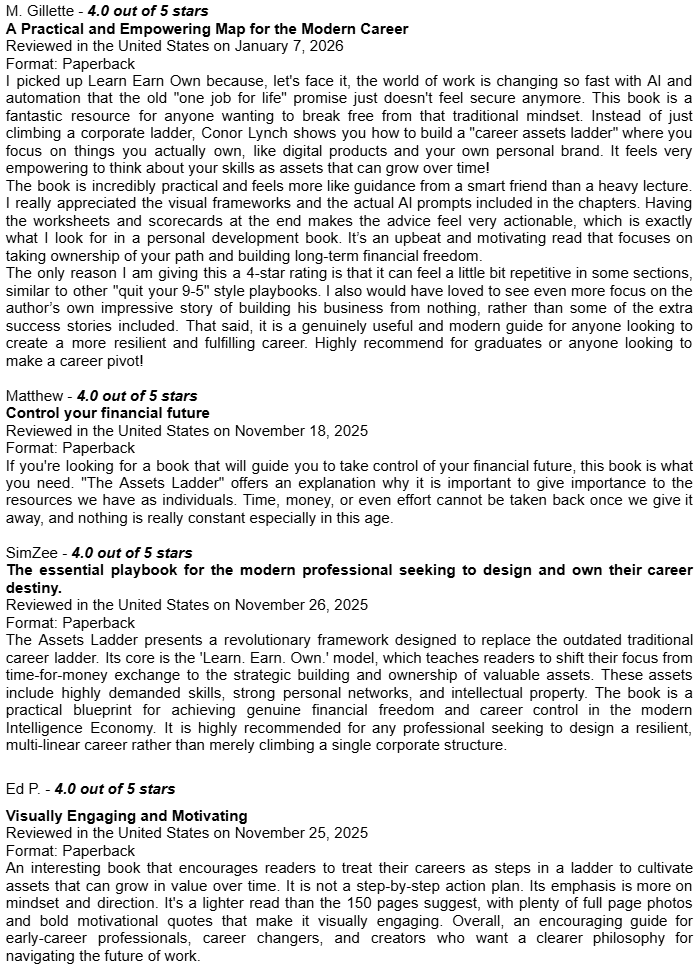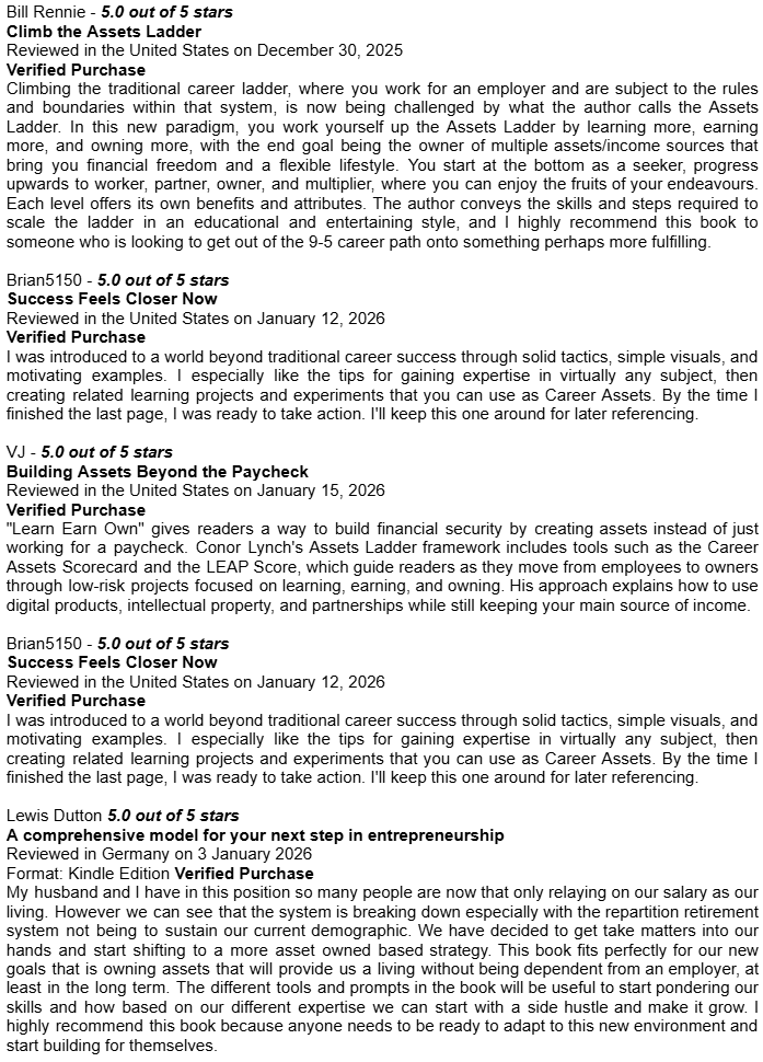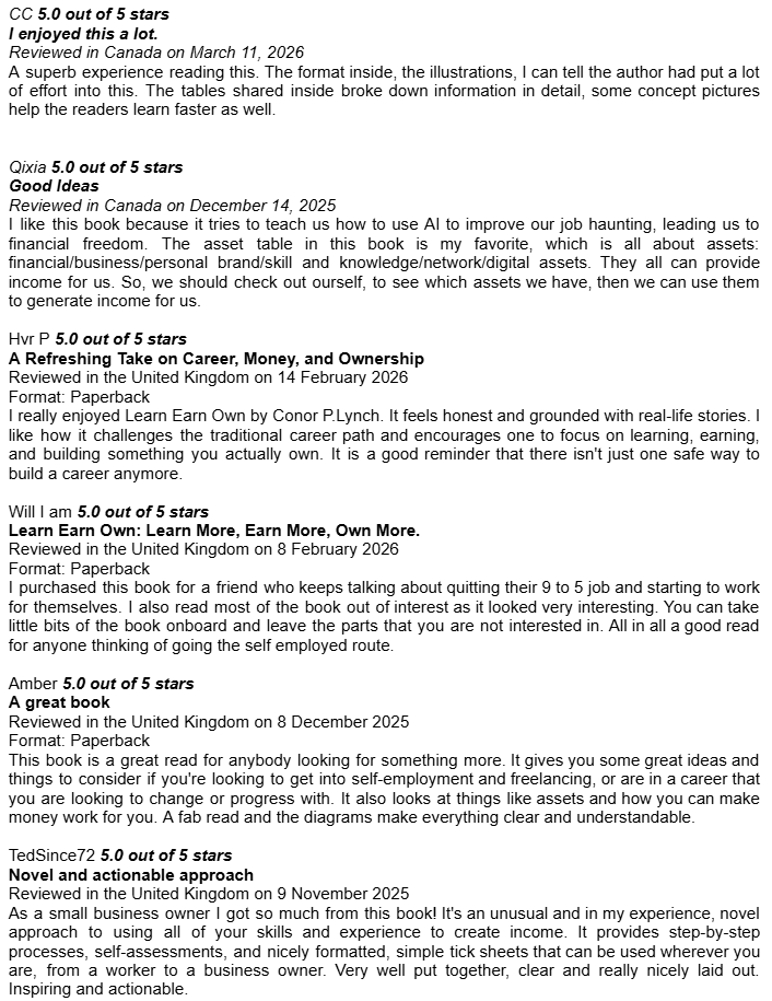 Amazon Book Reviews for Learn Earn Own + The Assets LadderDelighted to be averaging 4.8 / 5.0Conor P. LynchApr 14, 2026ShareHere are some of the book reviews from the various Amazon websites for my two book editions: Learn Earn Own - Essential Edition The Assets Ladder - Professional Edition Leave a commentPreviousNext