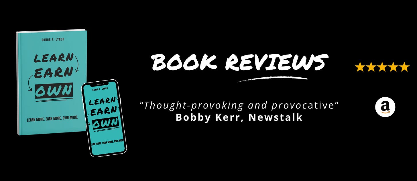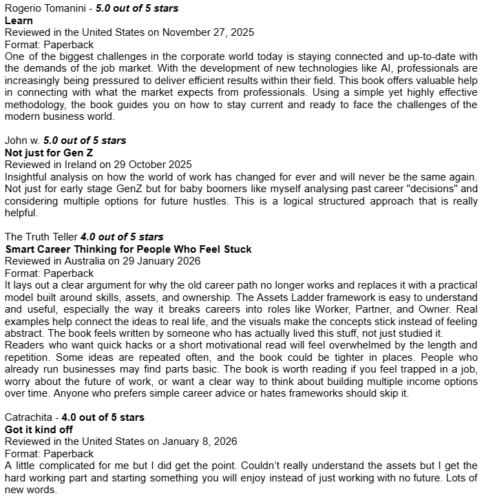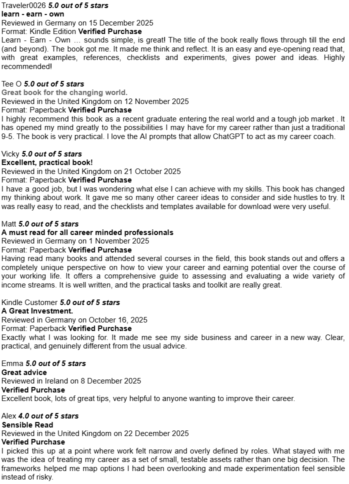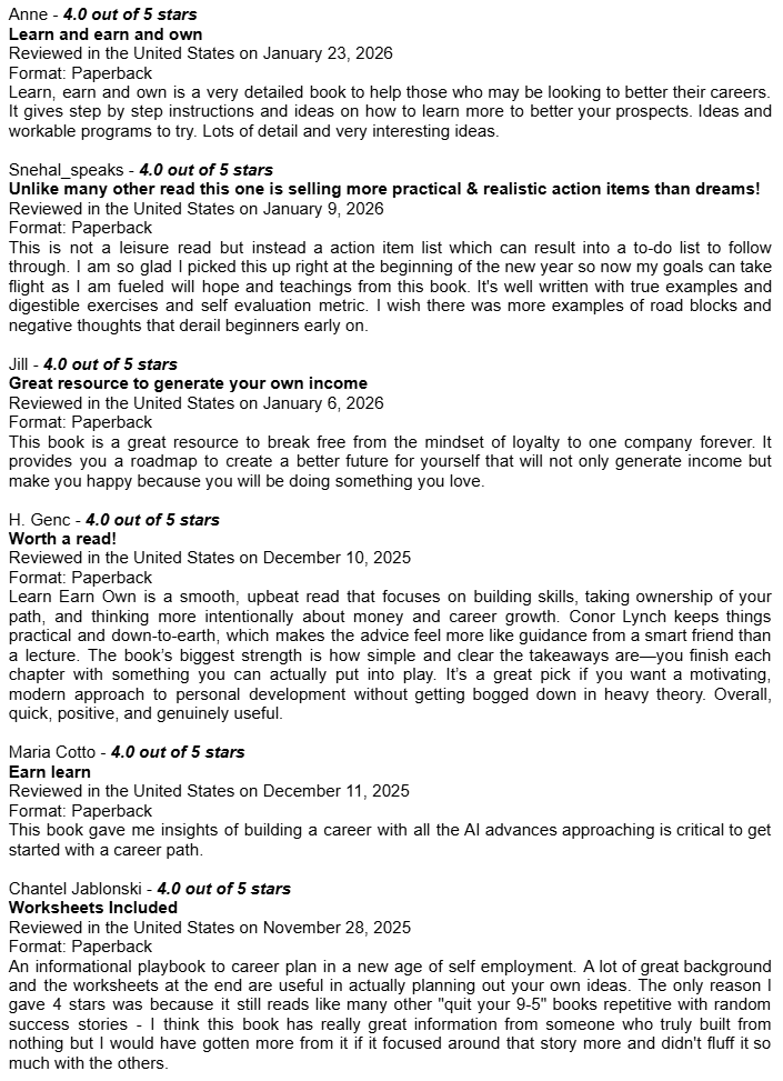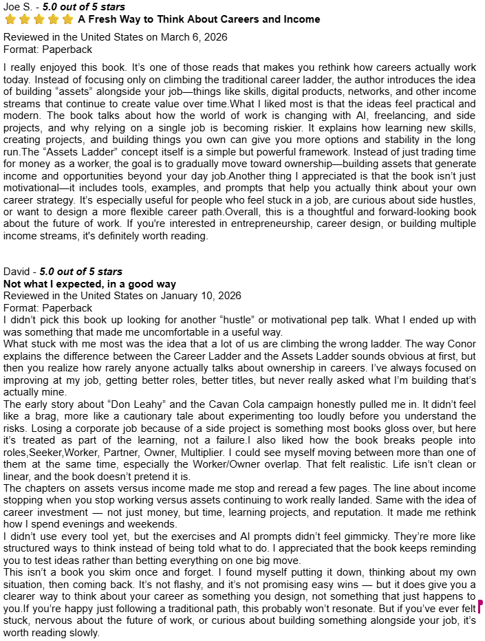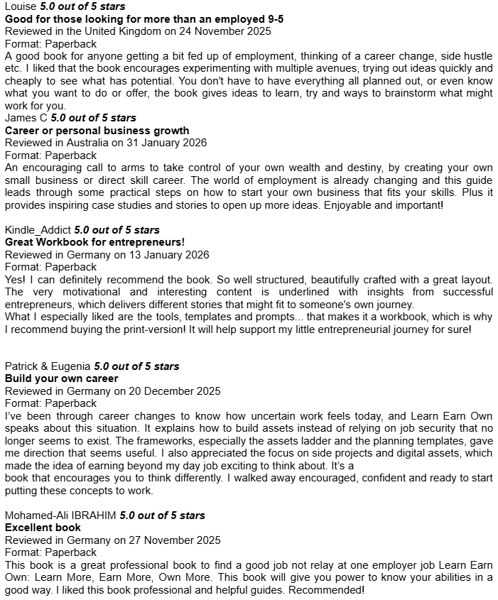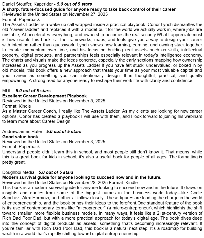 Amazon Book Reviews for Learn Earn Own + The Assets LadderDelighted to be averaging 4.8 / 5.0Conor P. LynchApr 14, 2026ShareHere are some of the book reviews from the various Amazon websites for my two book editions: Learn Earn Own - Essential Edition The Assets Ladder - Professional Edition Leave a commentPreviousNext
