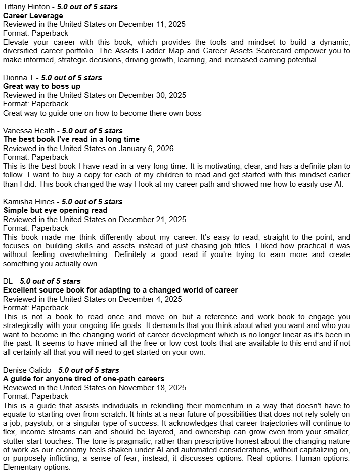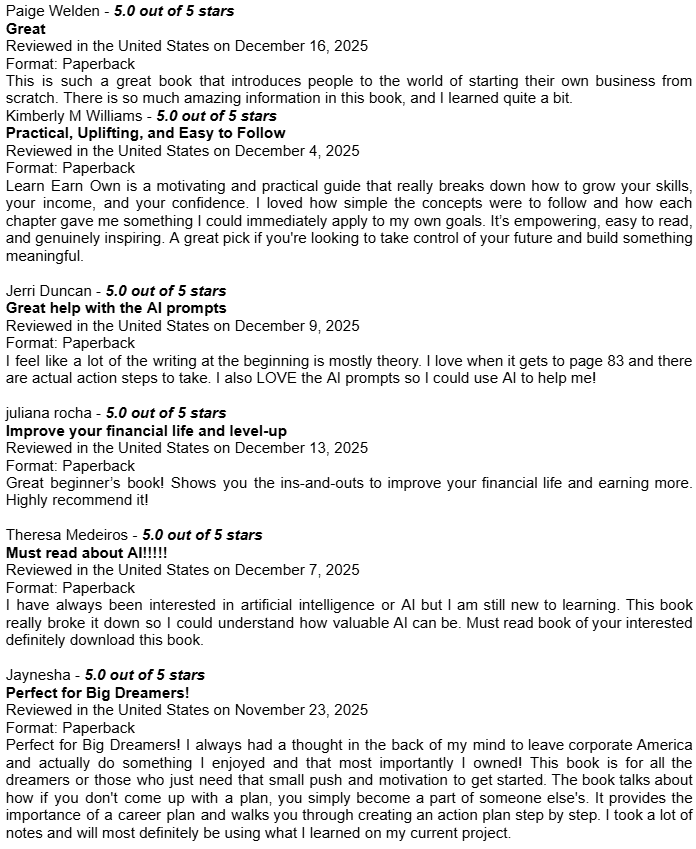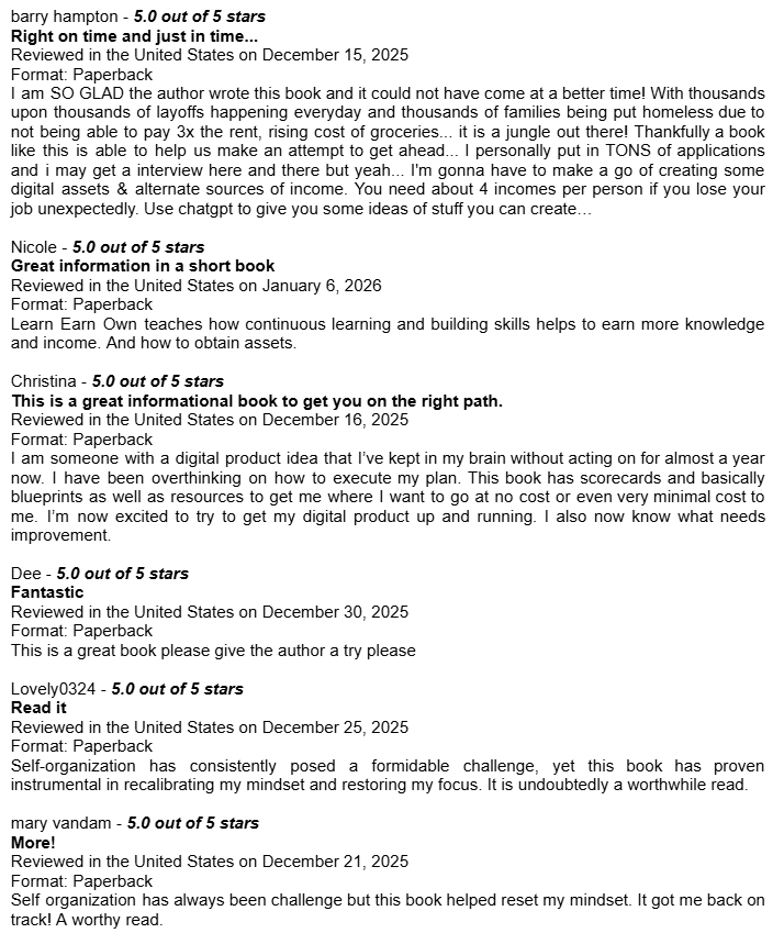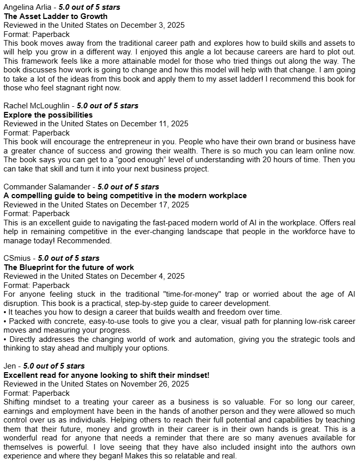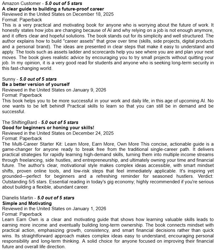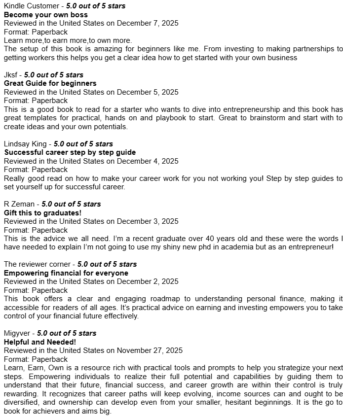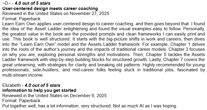 Amazon Book Reviews for Learn Earn Own + The Assets LadderDelighted to be averaging 4.8 / 5.0Conor P. LynchApr 14, 2026ShareHere are some of the book reviews from the various Amazon websites for my two book editions: Learn Earn Own - Essential Edition The Assets Ladder - Professional Edition Leave a commentPreviousNext