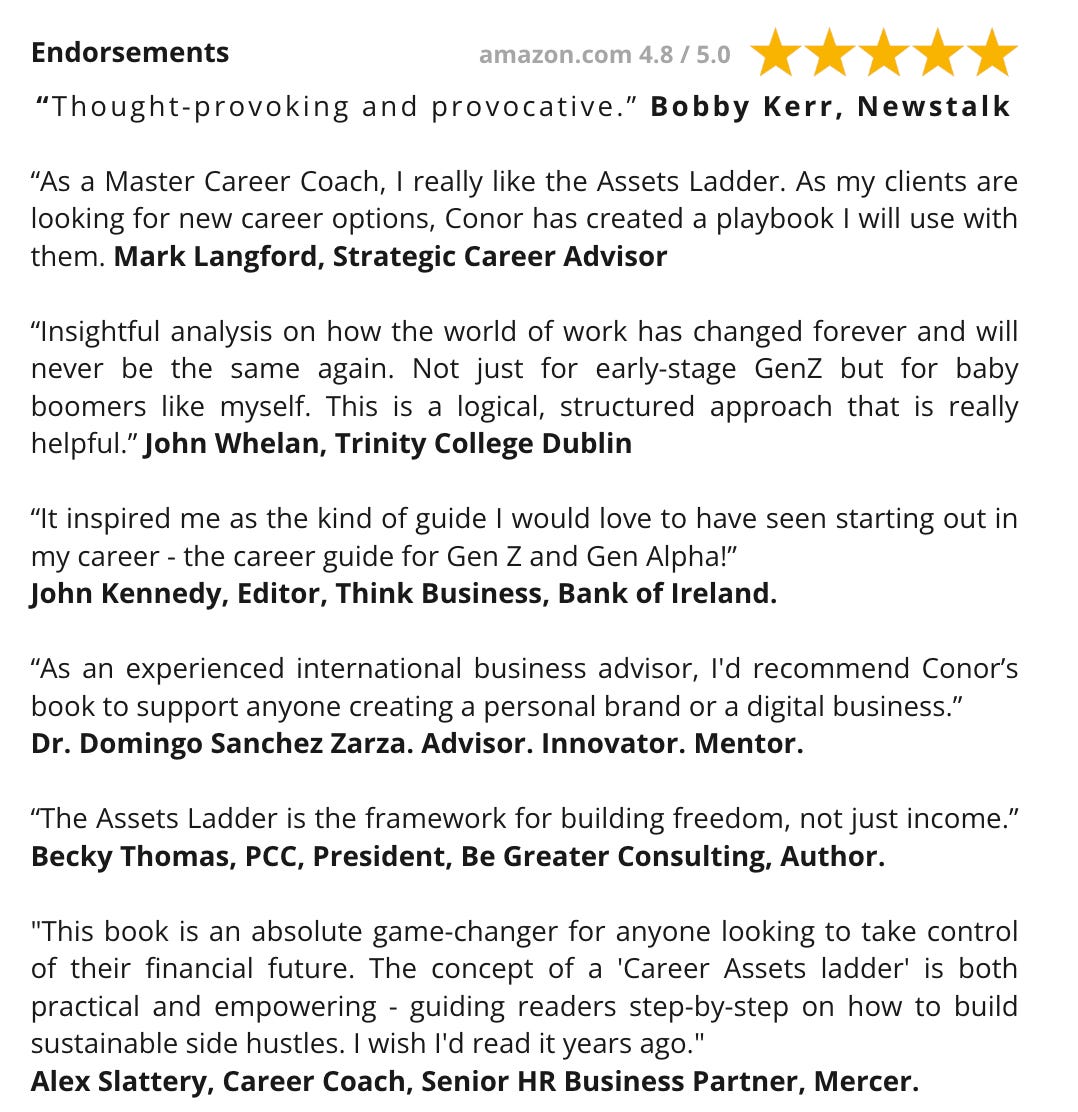 Instead of relying on one job and one employer, readers learn how to design a career that compounds over time, so they don’t get stuck, replaced, or left behind. I want to move you from dependence towards independence by generating new income streams.